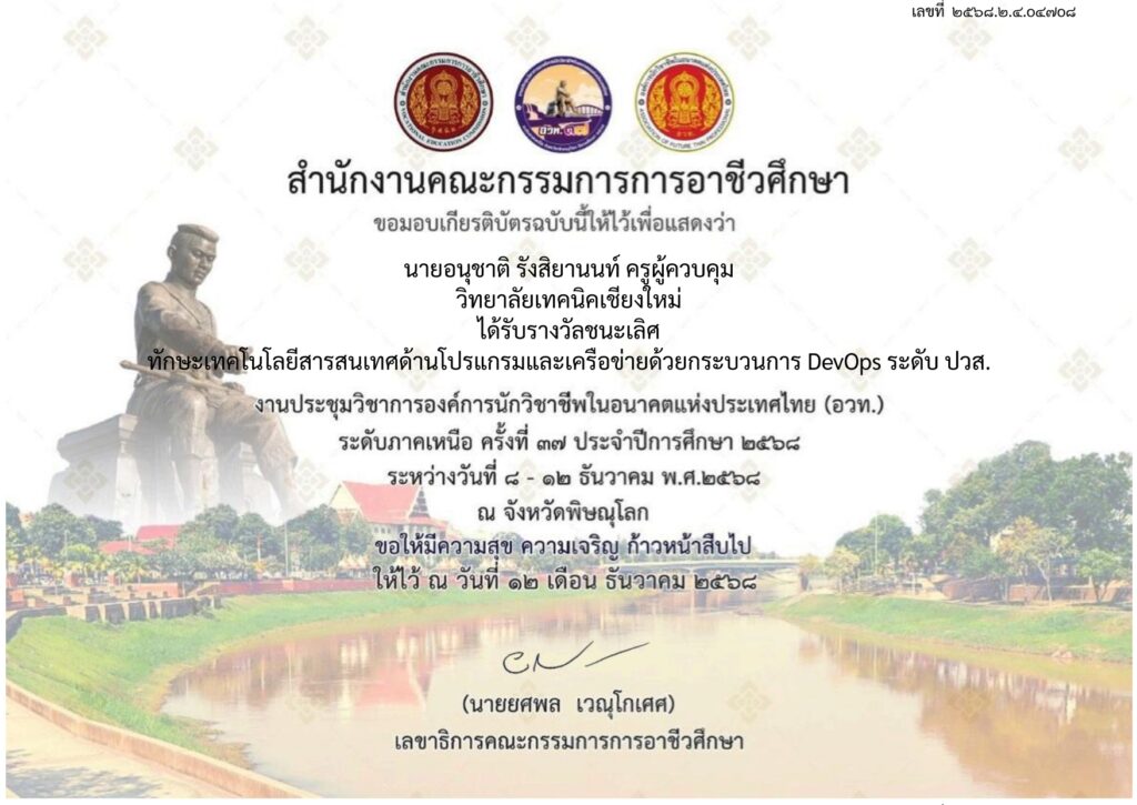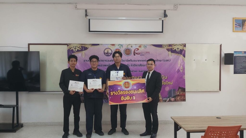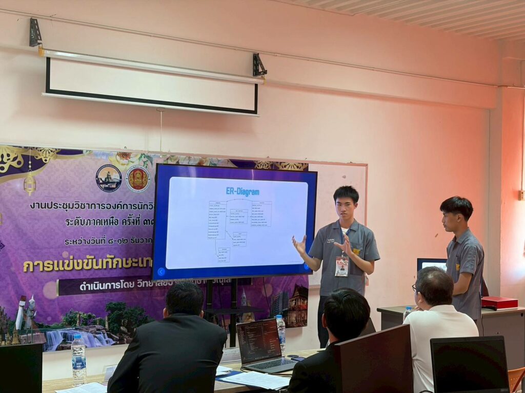 วันศุกร์ที่ 12 ธันวาคม 2568 ดร.วัชรพงศ์ ฝั้นติ๊บ ผู้อำนวยการวิทยาลัยเทคนิคเชียงใหม่ ปฏิบัติหน้าที่ผู้อำนวยการสำนักงานอาชีวศึกษาจังหวัดเชียงใหม่ และรักษาการในตำแหน่งที่ปรึกษาด้านนโยบายและแผน สำนักงานคณะกรรมการการอาชีวศึกษา ได้มอบหมายให้นายอนุชาติ รังสิยานนท์ และ นายธีรภัทร์ ชมภูนุช ครูแผนกวิชาเทคโนโลยีสารสนเทศ นำนักเรียน นักศึกษา เข้าร่วมการแข่งขันทักษะวิชาชีพและทักษะพื้นฐาน ระดับภาคเหนือ ครั้งที่ 37 ประจำปีการศึกษา 2568 ณ วิทยาลัยอาชีวศึกษาพิษณุโลก ระหว่างวันที่ 8–12 ธันวาคม 2568 ซึ่งนักเรียน นักศึกษา แผนกวิชาเทคโนโลยีสารสนเทศ สามารถทำผลงานได้อย่างยอดเยี่ยม คว้ารางวัลรวมทั้งสิ้น 3 รางวัล ดังนี้
