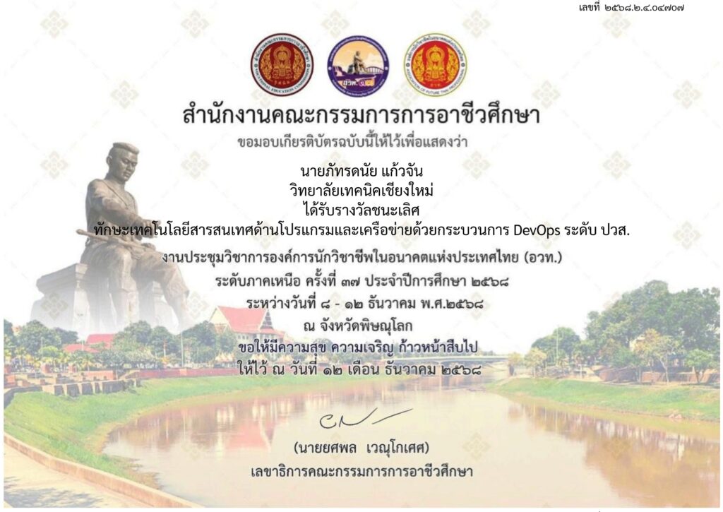 🥇รางวัลชนะเลิศ มาตรฐานเหรียญทอง ทักษะเทคโนโลยีสารสนเทศด้านโปรแกรมและเครือข่ายด้วยกระบวนการ DevOps ระดับ ปวส. ประเภท ทีม